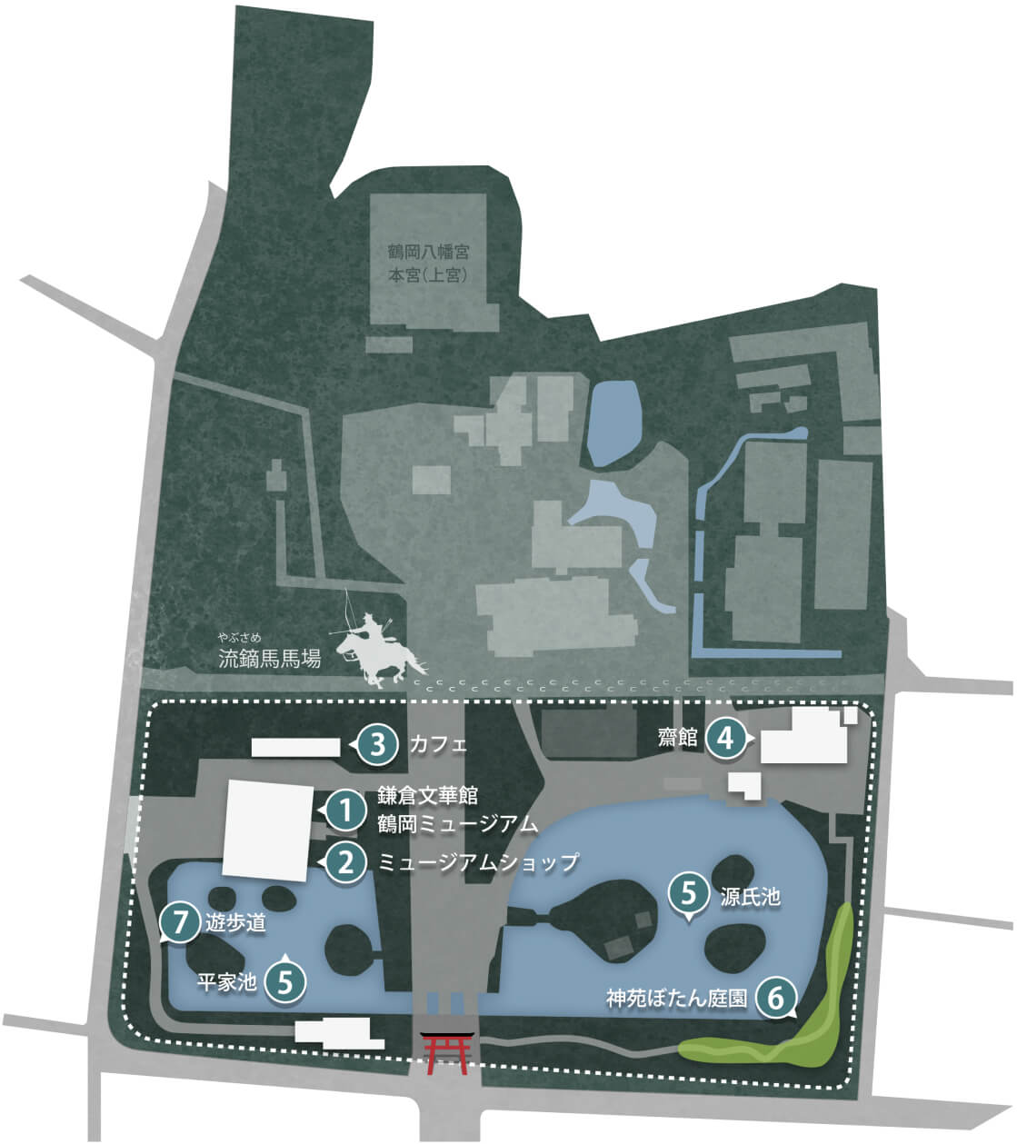 鶴岡八幡宮境内にある流鏑馬(やぶさめ)馬場南側の源平池周辺は、鎌倉文華館 鶴岡ミュージアムを中心とした憩いと交流の空間です。